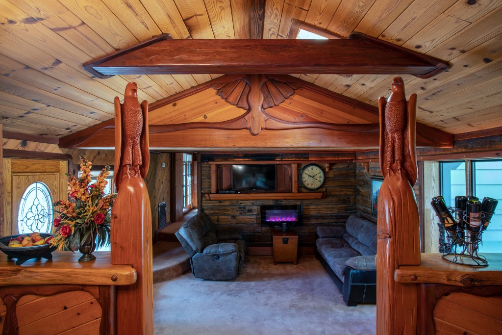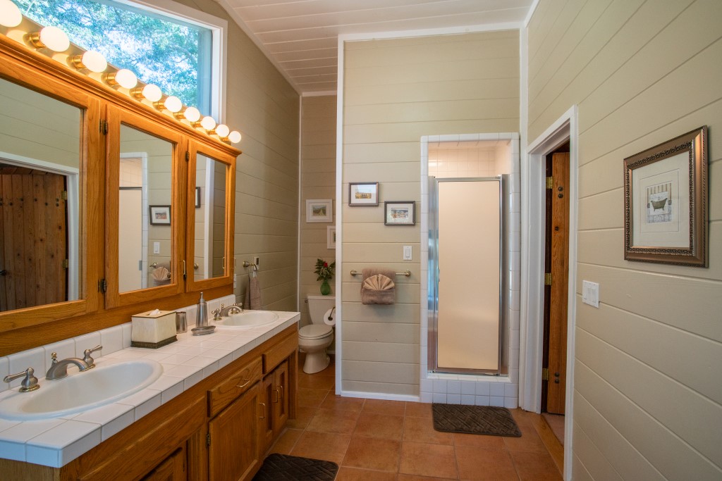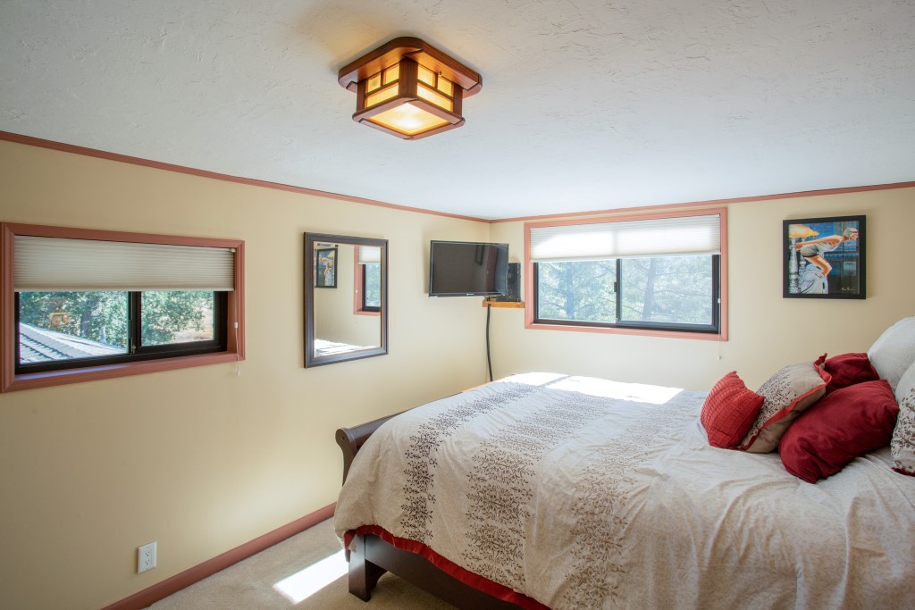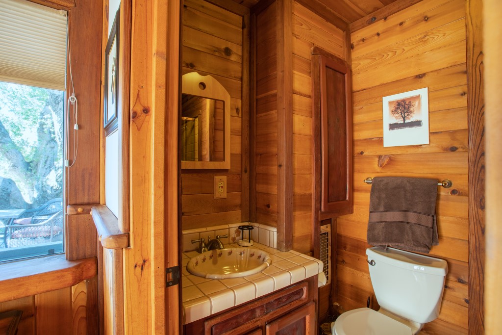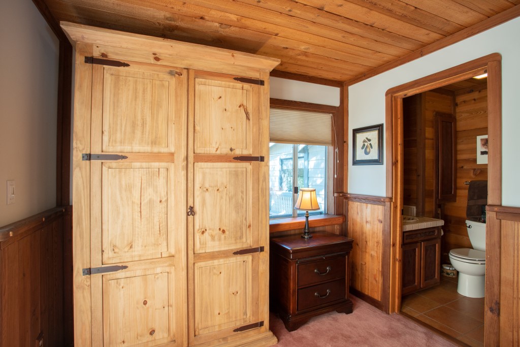 This Private Craftsman’s “Lodge” is a woodworker’s dream! The Lodge is finished throughout with old growth redwood. Interior of the home is custom finished in wood with large redwood beams, redwood carvings, tongue & groove wood ceilings & walls along with carved window sills. The Lodge has 3 Bedrooms – 2 Queens & 1 Twin Murphy bed, along with 3 Bathrooms. Master bedroom also boasts a suite & dressing area with French doors leading out to its own private deck. The lodge is 1,760 sq. ft. and has a fully equipped kitchen with cookware, small appliances, dinnerware, silverware, glasses & utensils. The house has a large flat screen HD TV, WIFI, VCR & DVD player. High-speed wireless internet is also provided. An airbed is available for additional guests’ sleeping space. The Lodge comes with a common Washer & Dryer area, Relaxing back yard, Gas BBQ for outdoor cooking, WIFI for the kids, peace & serenity for the adults. Far enough away from the sounds of town, yet still close enough to be convenient. All this in a 3 acre gated property. Extra parking is available for large events please ask about cost